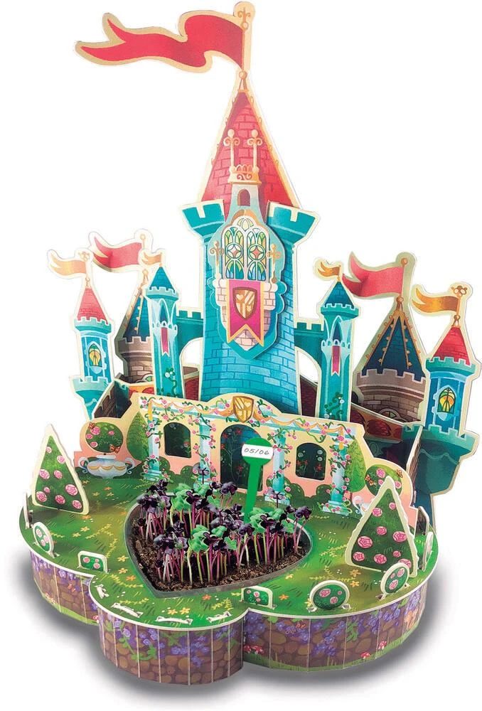 Construis ton château et crée ton jardin intérieur avec de vraies plantes. Contient des panneaux en carton, 1 pots en forme de cœur, 1 pipette, 1 sachet de terre et 1 sachet avec des graines.