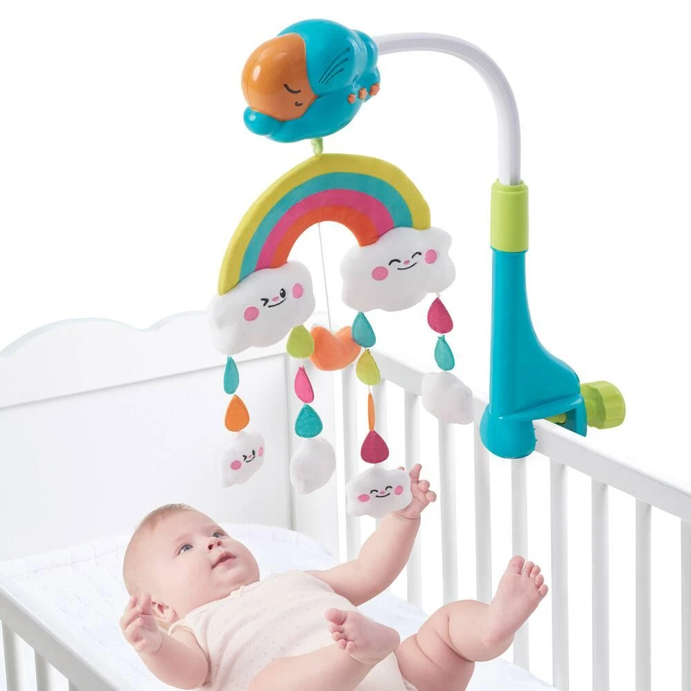 Mobile sur le thème du ciels pour de doux rêves enchantés. Suspensions toutes douces aux couleurs vives, adaptées à l’évolution de la vision de l’enfant. 12 berceuses pour accompagner l’endormissement de l’enfant. Rotation à 360° des suspensions du mobile – ATTENTION ! Afin d’éviter tout risque de blessure suite à un enchevêtrement, ôter le jouet dès que l’enfant tente de se mettre à quatre pattes ou de ramper.