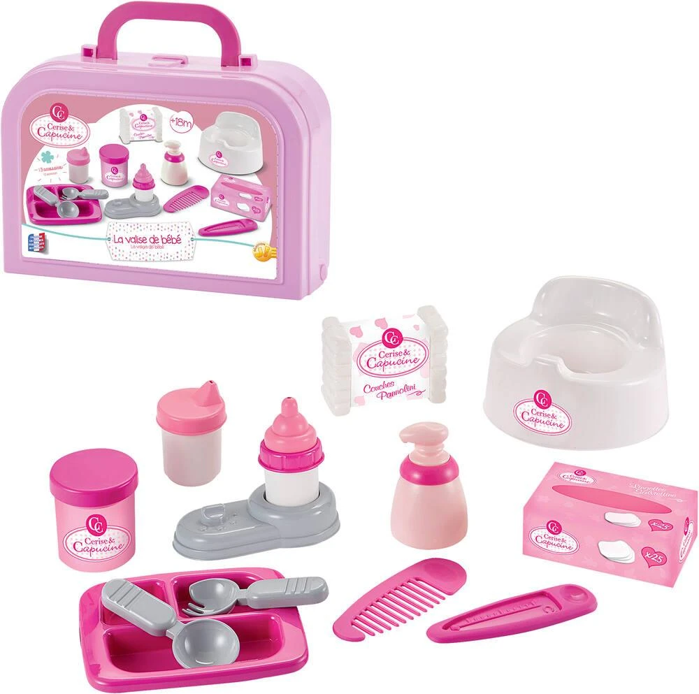 Une petite valisette remplie d’accessoires pour prendre soin de sa poupée. Le set comprend un pot, un assiette, 2 couverts, un paquet de couches factices, une boîte factice de lingettes, une boîte de talc, un peigne, un thermomètre, un distributeur de savon liquide, un chauffe biberon, un biberon et un verre avec bec verseur.