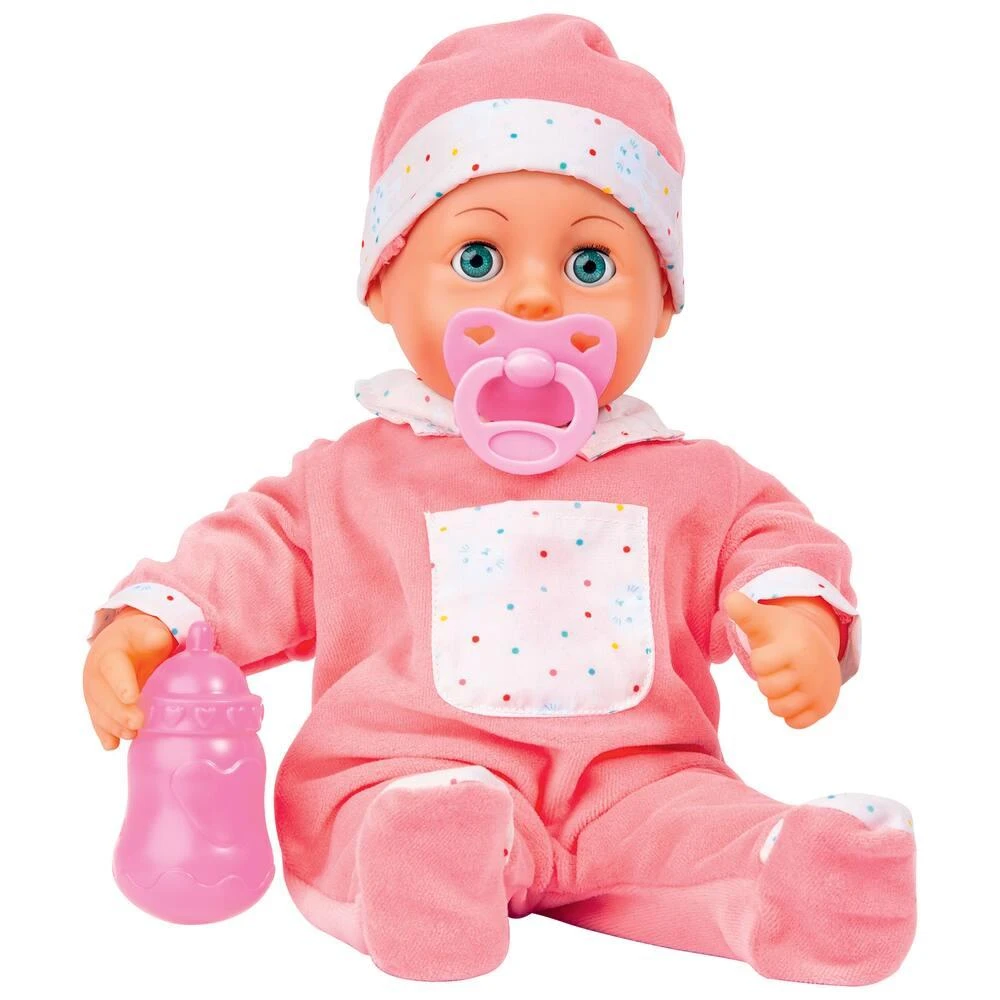 Poupon interactif de 38 cm au corps souple avec 12 sons réalistes de bébé : « maman », « papa », « pipi », pleure, rit, s’étonne, éternue, dort… Il est livré avec une tétine et un biberon.