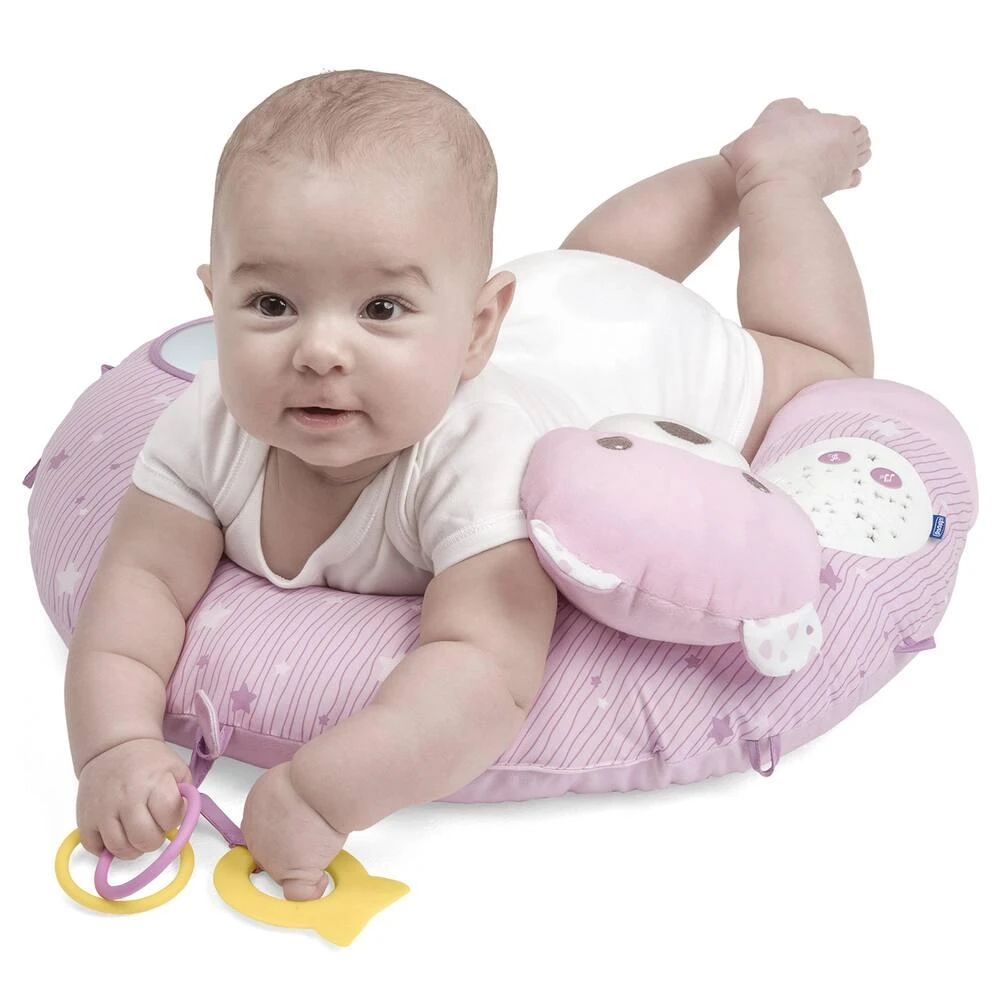 Un coussin évolutif musical et lumineux qui permet à votre enfant de se détendre paisiblement pendant les différentes phases de croissance. Dés 2 mois position sur le ventre, pour renforcer le cou et les épaules de bébé. A partir de 6 mois soutien pour la position assise. Electronique : 30 minutes de musique (classique, soft rock, jazz) et effets de lumières. Avec un miroir et un anneau de dentition. Lavable en machine.