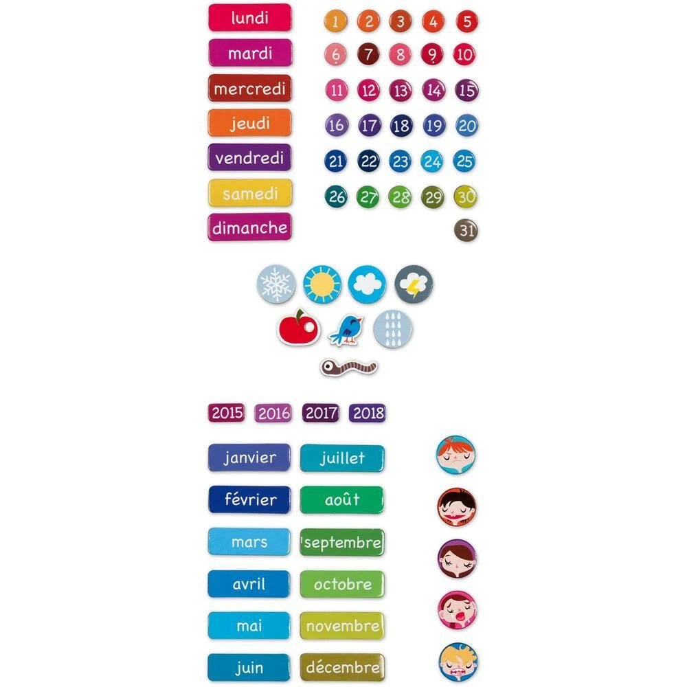 Pour les enfants et les parents désireux de maîtriser le temps ! Composé d’un tableau à suspendre et de 71 magnets pour indiquer la date (jour / mois / année), la météo et l’humeur du moment, chaque jour, tout au long de l’année ! Cet agenda accompagnera votre enfant pour lui apprendre à acquérir la notion du temps tout en devenant autonome.