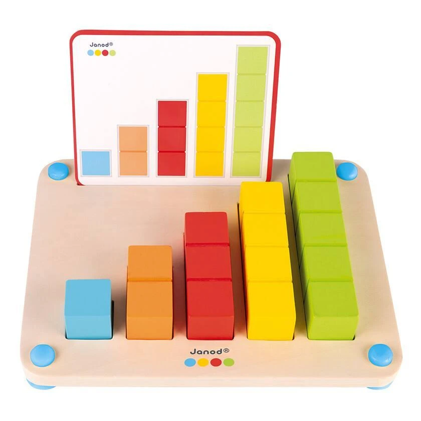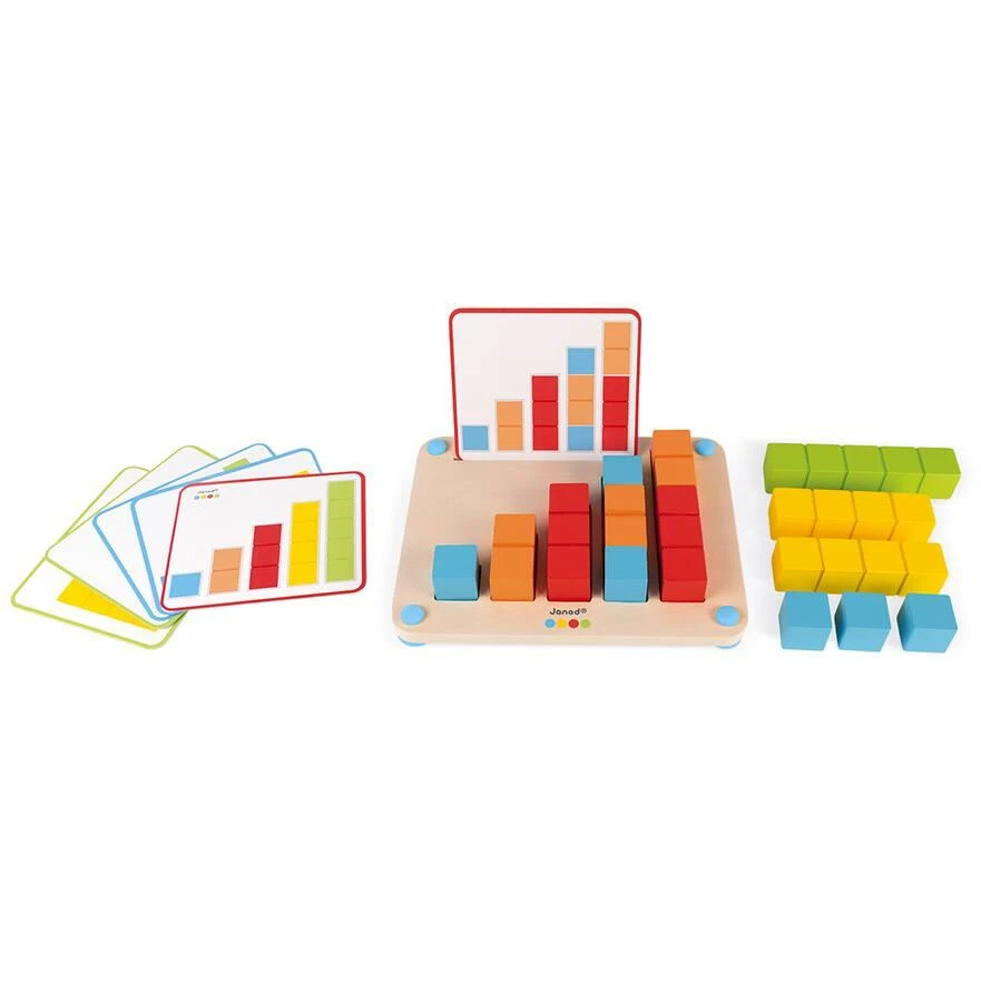 Voici un jeu éducatif pour apprendre à compter et devenir un as des mathématiques tout en s’amusant ! Avec 12 modèles et 14 barres graduées de différentes couleurs et tailles, l’enfant pourra jouer de 2 façons : – Pour les débutants : en plaçant les bâtons au bon endroit sur le plateau pour compter jusqu’à 5 ou pour visualiser les différentes façons de compter en suivant le modèle. – Pour les experts : en réalisant les 1ères additions à l’extérieur du plateau en suivant le modèle. Combien font une barre orange + une barre rouge ? Réponse : une barre verte. Très astucieux, le plateau est équipé de pieds antidérapants en silicone pour plus de stabilité. Ce produit développe la notion d’apprendre à compter, découvrir et expérimenter. Pièces peintes à l’eau. Bois : contreplaqué (plateau), merisier (cubes).