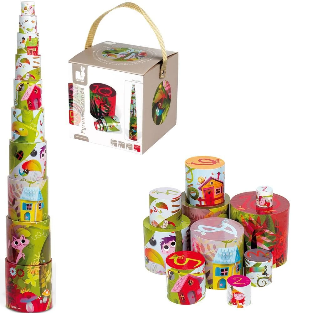 Pyramide en carton, pour les enfants de 1 à 3 ans, composée de 10 éléments à empiler pour reconstituer une magnifique pyramide : chaque élément doit être positionné de façon à ce que les illustrations coïncident entre elles. Au fur et à mesure que votre enfant empilera les blocs, il découvrira un arbre magique avec plein de surprises qui l’attendent à chaque recoin. Sur le dessus de chaque élément figure également un chiffre. Avec cette pyramide, votre enfant apprendra à compter jusqu’à 10 et développera sa motricité et son imagination tout en s’amusant !