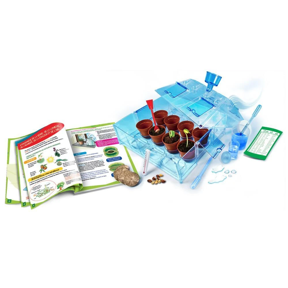 Expérimente la germination et la croissance des plantes en toutes saisons ! Arrose les plantes à l’aide de l’ingénieux système d’irrigation. La serre est composée de sa base et de son couvercle transparents, livrée avec des panneaux d’aération et d’un réservoir d’eau, thermomètre, 2 verres avec couvercle, pipettes, pots, spatule, tourbe, graines. Manuel d’instructions inclus.