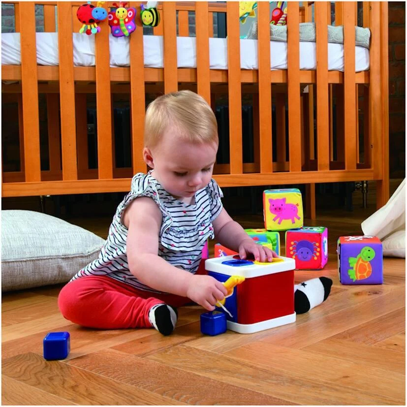 A partir de 12 mois, les tout-petits deviennent beaucoup plus curieux et aventureux. Ils adorent ranger, cacher et empiler les choses. Lors de cette phase, les bambins reconnaissent les formes et les couleurs et les sons familiers. Ambi toys propose des boîtes à formes ainsi que des jeux à empiler et à tirer. Montrez-lui comment faire les choses et il les fera très vite tout seul ! Cette solide boîte verrouillable est dotée de deux séries de blocs de formes différentes pour jouer sur l’association des couleurs et des formes. La serrure fait un bruit de roue à cliquet quand la clé géante inamovible tourne.