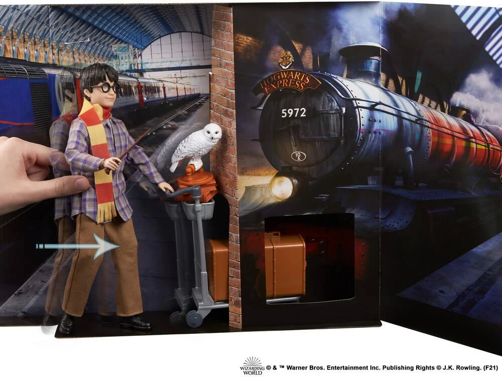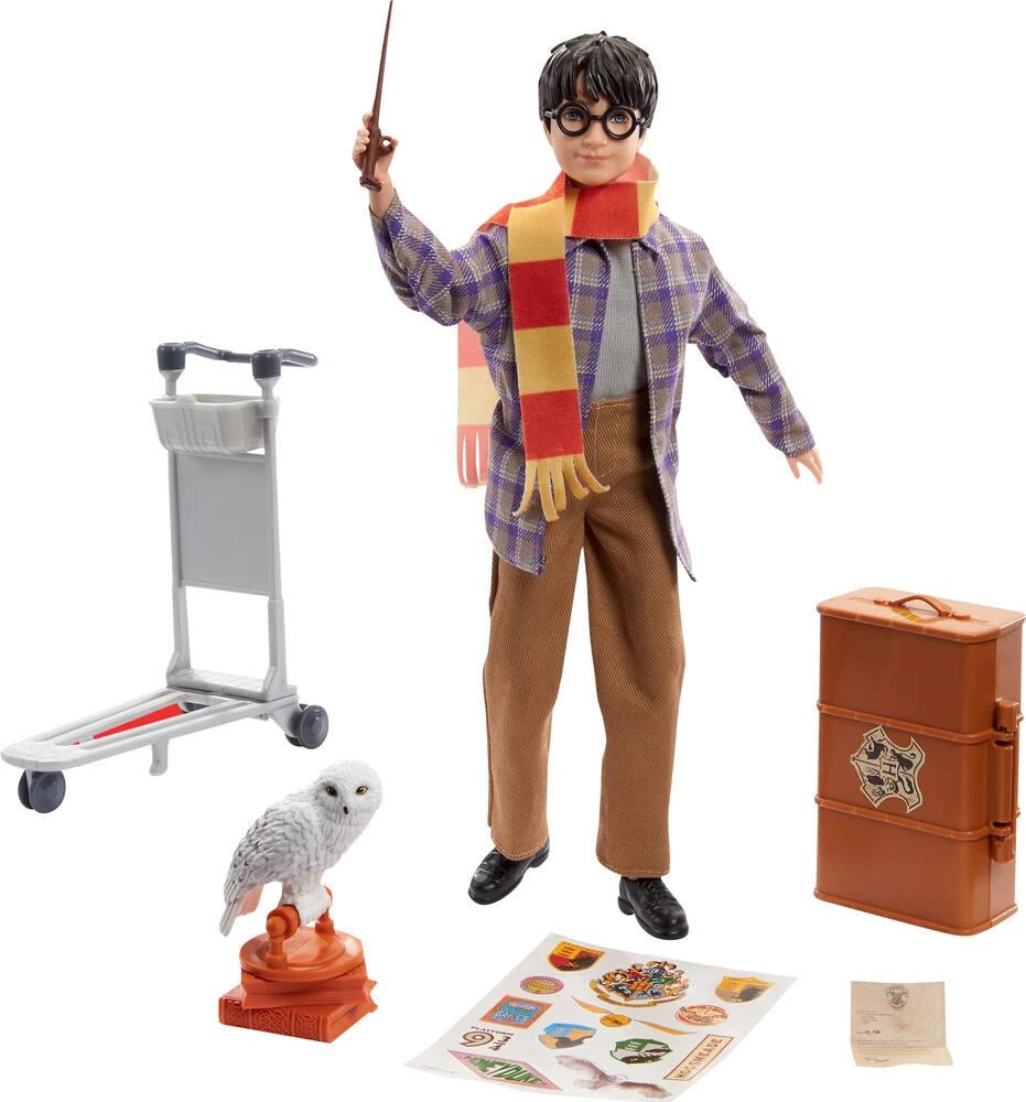 En tenue de ville avec écharpe de Gryffondor au cou, Harry emporte sa baguette, Hedwige la chouette, un chariot, une malle et d’autres accessoires.