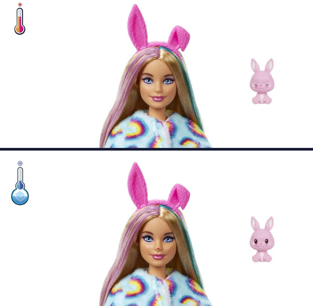 Les poupées Barbie® Cutie Reveal font de la découverte du jouet une expérience adorable. Le coffret comprend 10 surprises, dont une poupée Barbie® articulée ! Ouvrez l’emballage pour découvrir un chiot tout doux et quatre sachets-surprises. Retirez le costume de chiot pour dévoiler une poupée Barbie® aux cheveux longs et détails scintillants. Ouvrez les sachets-surprises, qui contiennent des vêtements et des accessoires scintillants, un peigne-éponge et un mini-chiot. Les enfants peuvent habiller et accessoiriser la poupée Barbie® : le haut du costume est réversible et se transforme en veste en polaire toute douce tandis que la tête du costume devient un petit lit pour animal ! Les surprises adorables ne s’arrêtent pas là : certains éléments peuvent changer de couleur. Un maquillage animalier apparaît sur le visage de Barbie® et son chiot « ouvre et ferme » les yeux. Il est tellement mignon ! Prenez le peigne-éponge et appliquez de l’eau froide pour commencer la transformation. Utilisez de l’eau chaude pour retrouver les couleurs initiales. Découvrez toutes les surprises mignonnes de cette collection Barbie® Cutie Reveal. Contient une poupée avec son costume animal et 10 surprises. La poupée ne tient pas debout toute seule. Les couleurs et les décorations peuvent varier.