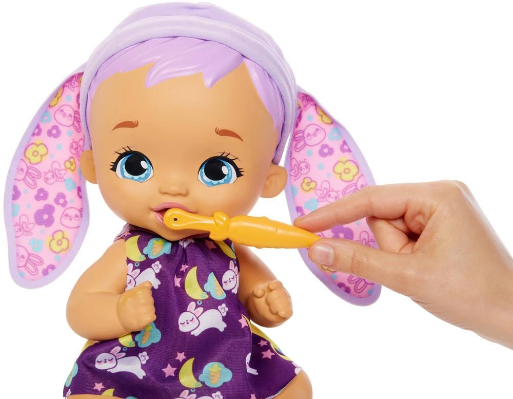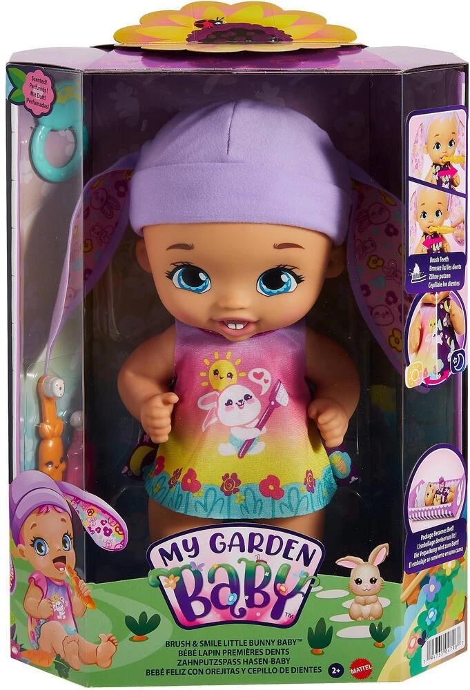 La poupée Bébé Lapin Premières Dents de My Garden Baby (30 cm) a des oreilles souples et un doux parfum de fleur. Ce bébé lapin a besoin que l’on prenne bien soin de lui. La tête de la poupée bouge de droite à gauche quand on lui lave les dents avec la brosse à dents fournie ! Cette poupée porte une tenue 2 en 1 (robe d’été et chemise de nuit) pour que les enfants puissent imaginer l’heure du lever et du coucher. Un anneau de dentition réversible permettra d’apaiser bébé. L’emballage se transforme en berceau. Les couleurs et les décorations peuvent varier.