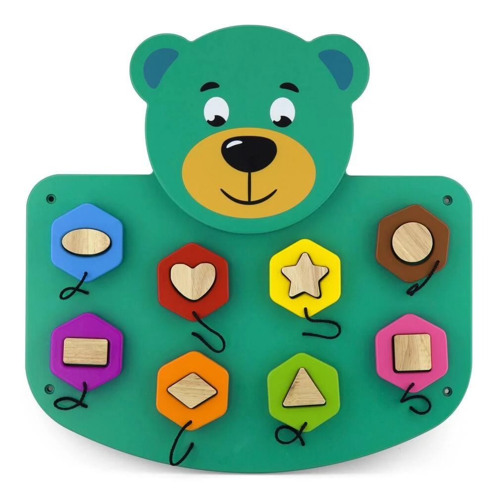 Ce joli tableau avec une tête d’ours permet aux enfants la reconnaissance des formes géométriques et des couleurs. L’enfant doit encastrer les 8 formes correspondantes, il peut aussi s’aider des couleurs. Les pièces à emboîter sont attachées au tableau (via une cordelette). Possibilité d’utilisation posé au sol ou fixé à un mur à hauteur de l’enfant. 4 vis fournies pour la fixation murale. Grosses pièces pour une bonne préhension. Livré assemblé, la fixation au mur doit être effectuée par un adulte. Notice incluse. En bois massif. Poids du produit : 3 kg. Solidité et simplicité en font un bon jeu de dextérité pour les tout-petits. Design et couleurs attrayantes pour stimuler et distraire les enfants.