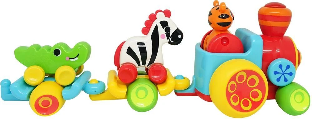 Train safari avec effets sonores et lumineux. Appuie sur la cheminée de la locomotive pour entendre de la musique et voir des lumières clignotantes. Train composé d’une locomotive et de deux wagons : locomotive avec un tigre basculant, un wagon avec un zèbre et l’autre avec un crocodile. Permet à l’enfant de découvrir différents mouvements.