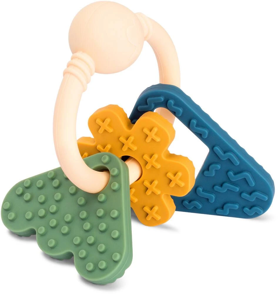 Avec ses formes inspirées de paysages, il fait du bruit grâce à un grelot qui permet de développer l’ouïe. Il est intégralement composé de silicone bénéficiant d’un grade alimentaire (FDA et LFGB standards). Les textures sont multiples permettant ainsi à bébé d’apaiser ses gencives douloureuses pendant les poussées dentaires. Il développe ainsi le toucher grâce à ses formes texturées inspirées de paysages. 3 pièces et un anneau avec grelot : l’ensemble est non détachable. Les pièces passent au lave-vaisselle pour un entretien facilité. Conçu avec une psychomotricienne. Instructions sur la boîte.