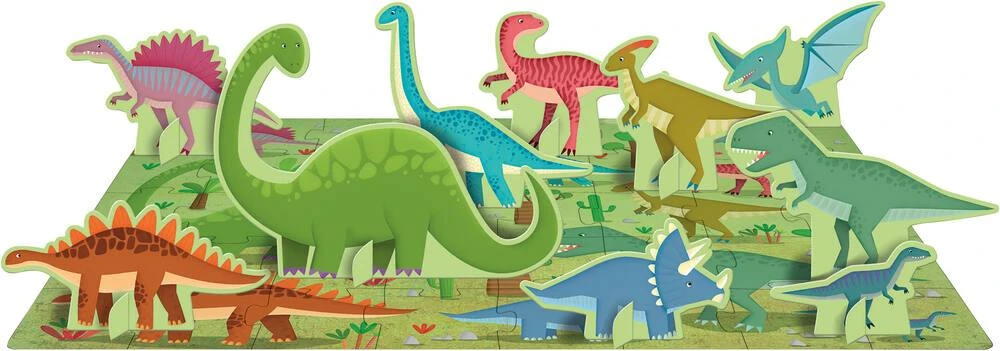 Un livre et un puzzle sur le thème des dinosaures pour apprendre à reconnaître et à associer les éléments et les mots. 40 Pièces.