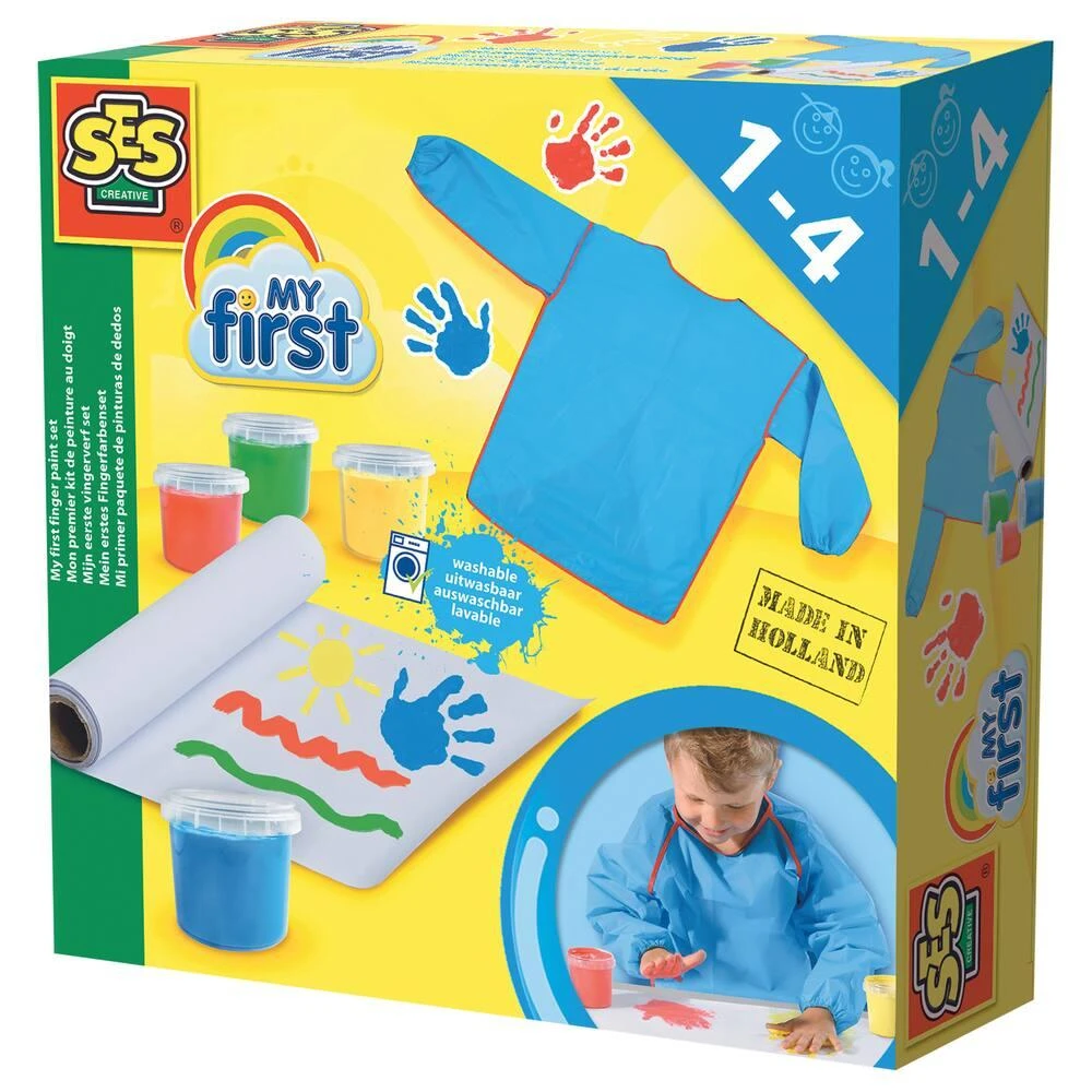 Ce kit SES My First contient tout ce dont les jeunes enfants ont besoin afin de se familiariser avec la peinture au doigt. Enfile le tablier, déroule le papier et tu peux commencer à peindre. Utilisation sans danger pour les enfants âgés de 1 an et plus.