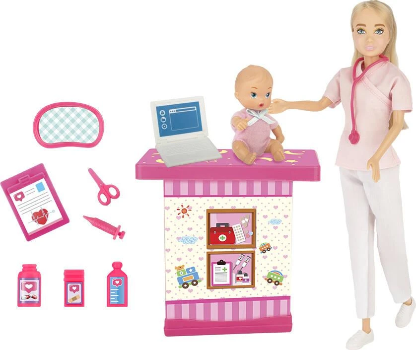 Poupée mannequin de 29 cm avec 1 bébé et des accessoires. Contenu : 1 poupée mannequin avec tenue et chaussures, 1 bébé avec tenue, 1 table d’examen, 1 ordinateur, 3 flacons de médicaments, 1 dossier médical, 1 seringue, des ciseaux et 1 plateau chirurgical. Instructions imprimées sur la boîte. Mode, sport ou voyage… Thaïs est la poupée tendance qui se révèle à travers ses passions.