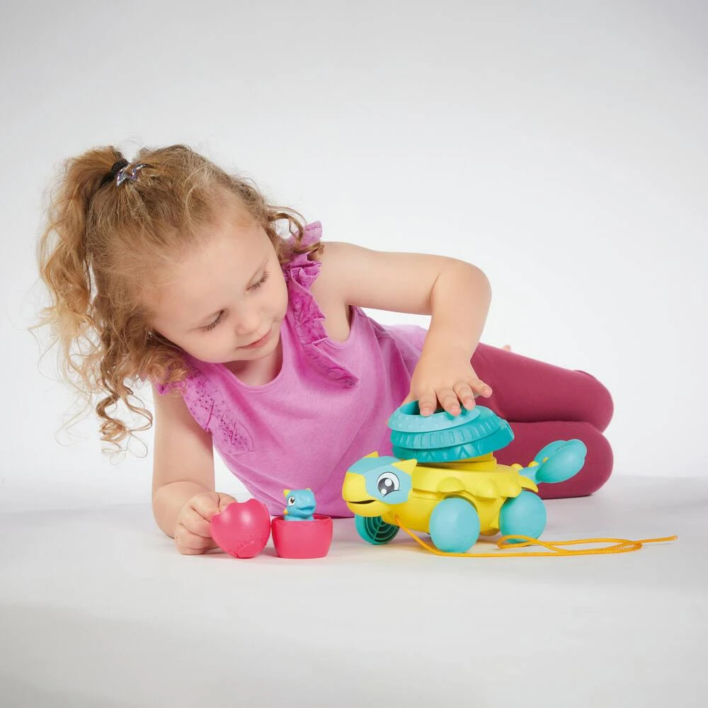 Promène cet adorable dinosaure avec son bébé dino sur le dos. Tire la maman ankylosaure à l’aide du cordon et regarde-la se déplacer avec sa démarche oscillante. Empile ses 4 anneaux sur son dos pour en faire une carapace et secoue le bébé dinosaure pour l’entendre grogner.