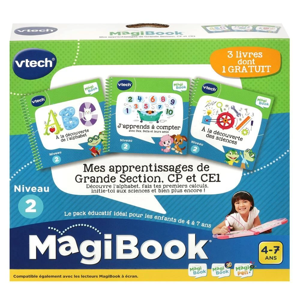 Pack de trois livres MagiBook (2 + 1 gratuit) en lien avec les programmes de l’éducation nationale. Contient : ABC à la découverte de l’alphabet, à la découverte des sciences, j’apprends à compter avec Rex, Bella et leurs amis. Apprentissages : lettres, problèmes, apprendre à compter, et bien plus encore ! Compatible avec tous les lecteurs Magibook (Magibook et MagiPen). Contenu audio et/ou vidéo à télécharger en connectant les plateformes MagiBook à l’ordinateur (plateforme Explor@ Park). Age : de 4 à 7 ans.