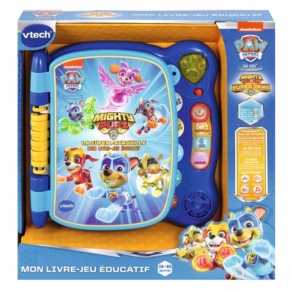 Pat Patrouille. Mon livre-jeu éducatif. De 3 à 6 ans. Un livre de 9 pages sensitives avec les Super-Chiots de la Pat Patrouille pour découvrir une nouvelle aventure trépidante. L’enfant choisit d’écouter l’histoire ou de jouer avec les 3 modes de jeu : 1. Mots : l’enfant appuie sur l’un des mots de la page pour l’entendre. 2. Lettres : pour découvrir les mots et les lettres qui le composent. 3. Musiques et Sons : pour jouer et s’amuser. En appuyant sur le bouton lumineux Pat Patrouille l’enfant valide ses apprentissages en répondant aux différentes questions. Avec la vraie voix des personnages de la série ! Arrêt automatique.