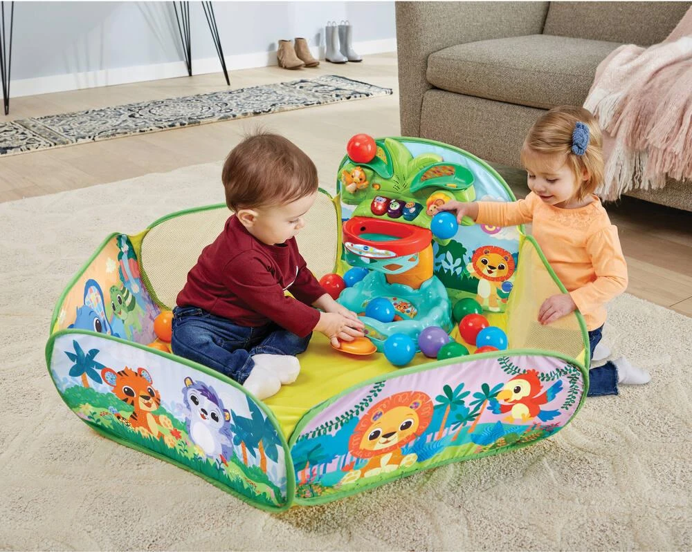 Piscine à balles interactive des P’tits loulous. Bébé développe sa motricité globale en lançant les balles dans le panier de basket en forme d’arbre. Génial ! Le panier est interactif, il reconnaît quand Bébé marque des points et compte les balles. Trop rigolo, Bébé éjecte les balles en appuyant sur le bouton central ! 3 boutons lumineux pour apprendre les chiffres, les couleurs et les animaux. 2 rampes pour voir dégringoler les balles. De nombreux éléments à manipuler pour développer la motricité fine de Bébé. 30 balles multicolores incluses. La piscine est légère et se plie facilement pour un rangement optimal. Plus de 90 chansons, mélodies, sons et phrases. 1 mètre de diamètre. Piscine lavable en surface après avoir retiré le module électronique. Arrêt automatique. De 9 à 36 mois.